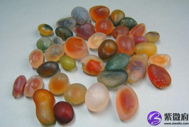 一般颜色亮丽(如蓝色,紫色,红色,粉色,三色等基本为烧色)真品玛瑙基本以灰色,白色,夹花色居多。