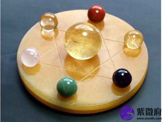 1.七星阵对角开始安置第一颗晶球,由黄水晶球、白水晶球、黑玉髓球、红玉髓球、粉晶球、萤石球依顺位顺时钟方向排列;正中的大主石球(萤石球)为最后定位之晶球。