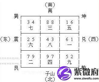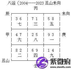 地盘;珠江新城地势为北高南低,北面近有瘦狗岭、五山与茶山,远有南岭系山脉为靠山,南面为珠江,依地势格局就是背面靠山,南面向水,北高南低的风水宝地,地势格局为坐北向南(子山午向),04年以前为七运,七运运盘如下;