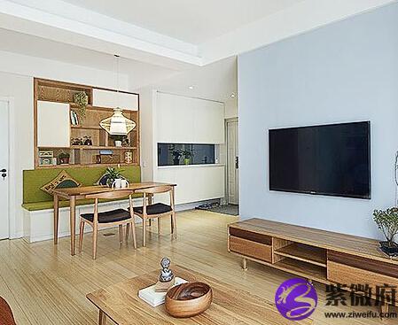 橱柜样式操作台延伸至餐桌旁。敞开式厨房,可以将部分橱柜功能延伸到餐厅中。把餐边柜当做备餐台,柜子上方安装层板,下面带有照明灯,一些不需要烹饪的食物可以在这里制作完毕,端上餐桌。因为经常要在桌面上处理食物,所以在选择时注意桌面的材质是否好清洁。用于备餐台的餐边柜,柜子最好选择带有抽屉的款式,用于存放厨具。
