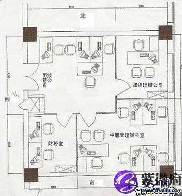 2.东北角为整个办公室的财位。而在近几年的流年上,可以说是一些位置最为得力、招财,特别是在06年一年内,所以就当时安排张总个人的经理室,放在此位,可得天运及贵人之力来发展;那么我们看到的,四方黑色的是柱子,可以说是在办公室内是不利的,但,当时我让张总坐北向南,那么,这些柱子就在东北角的位置,这样一来,反而有利。因为,东北角有柱子,东北角高起,财位更旺,是比较利于发展的位置。