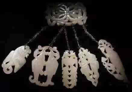 【腰饰】主要包括玉佩、带钩、带环、带板及其它腰间携挂物。材料一般以贵金属镶宝石或玉石居多。 我国早期的腰饰主要是玉佩,即挂系腰间的玉石装饰物。玉佩在古代是贵族或做官之人的必佩之物。