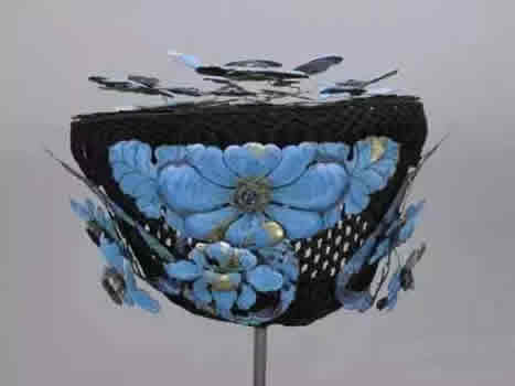 【花钿】 花钿[diàn]是古时妇女脸上的一种花饰。花钿有红、绿、黄三种颜色,以红色为最多,以金、银制成花形,蔽于脸上,是唐代比较流行的一种首饰。花钿的形状除梅花状外,还有各式小鸟、小鱼、小鸭等,十分美妙新颖。