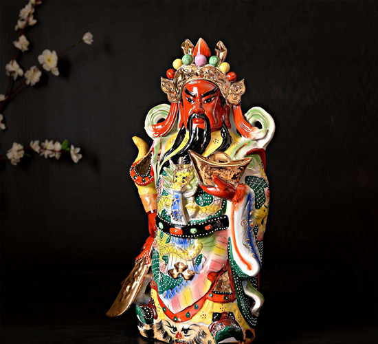 (2)关公:关公原名关羽,字云长,是三国时代的名将。形象威武,他不但忠勇感人,而且能招财进宝,护财避邪。有一点必须注意,摆放文财神以及武财神的方向有异,必须分清楚!满面祥和的文财神,不论是财帛星君,或是福禄寿三星均应向着自己屋内,而不应向着屋外。否则便会向屋外送财!至于威风凛凛的武财神则应面向屋外,或是面向大门,这样一方面既可招财入屋,同时又可镇守门户,不让外邪入侵。