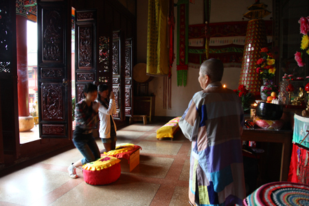 寺庙建筑都有许多道门,从哪一道门进入都是有讲究的。通常大殿正中间的三道门是供人出入的,普通游客,进门只能走右边的那道门,中间那道门叫空门,只有出家人才可以出入的。进门时,女客先迈右脚,男客先迈左脚,都要注意,一定不能踩在门槛上,而且这步子,需迈得越大越好。