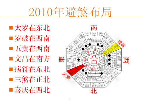 流年五黄,是每年换一个方向。2010年五黄在坤位也就是西南方,与大五黄重叠,所以2010年的五黄煞更凶。五黄煞是大凶之煞,重者死人、做牢,或大伤至残,或破大财;轻者生病、工作事业不顺,夫妻不和、离婚……。
